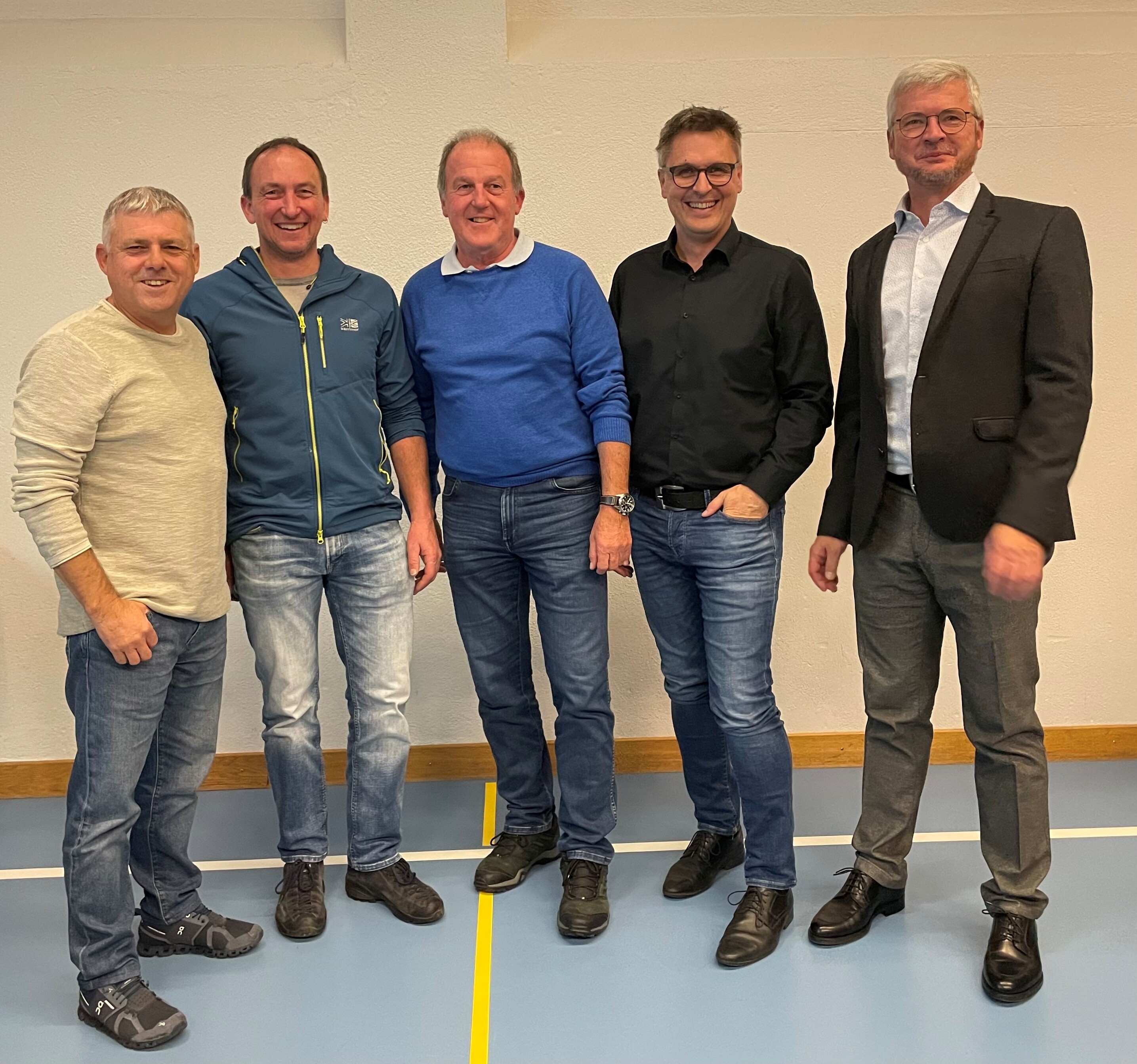 Bild 2: von links nach rechts: Rolf Infanger, ehem. Gemeindepräsident, Wendelin Loretz, ehem. Gemeindepräsident, Paul Indergand, abtretender Dorfverwalter, Hermann Epp, ehem. Gemeindepräsident, Willy Lussmann, amtierender Gemeindepräsident