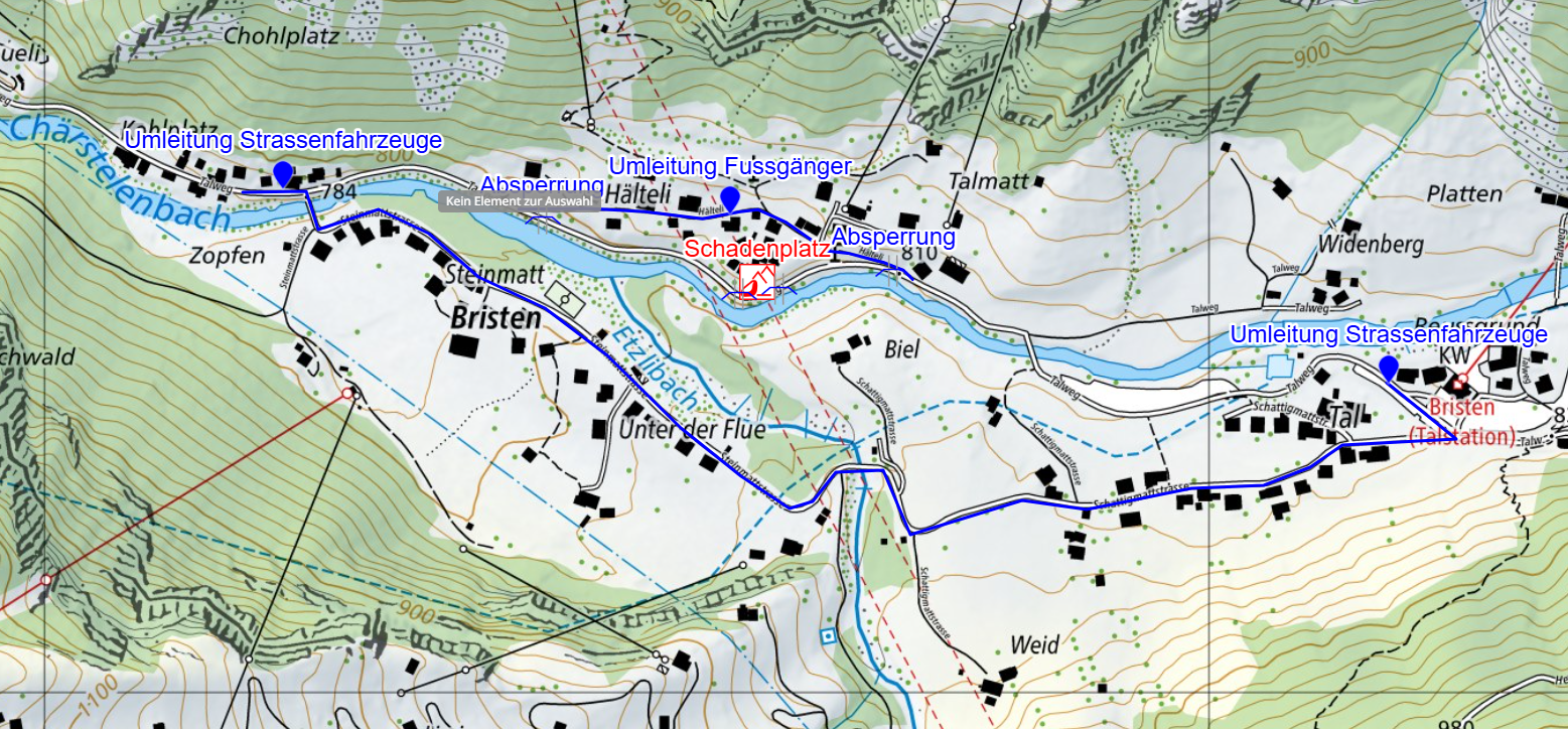 Aufgrund eines Steins, der droht auf die Strasse zu stürzen, ist der Talweg in Bristen zwischen Talweg 19 und der Verzweigung Hälteli/Talweg seit Freitagabend, 10. Oktober 2025 gesperrt. Die Umleitung erfolgt via Steinmatt-/Schattigmattstrasse. Fussgänger erreichen das Quartier Hälteli über den Talweg.