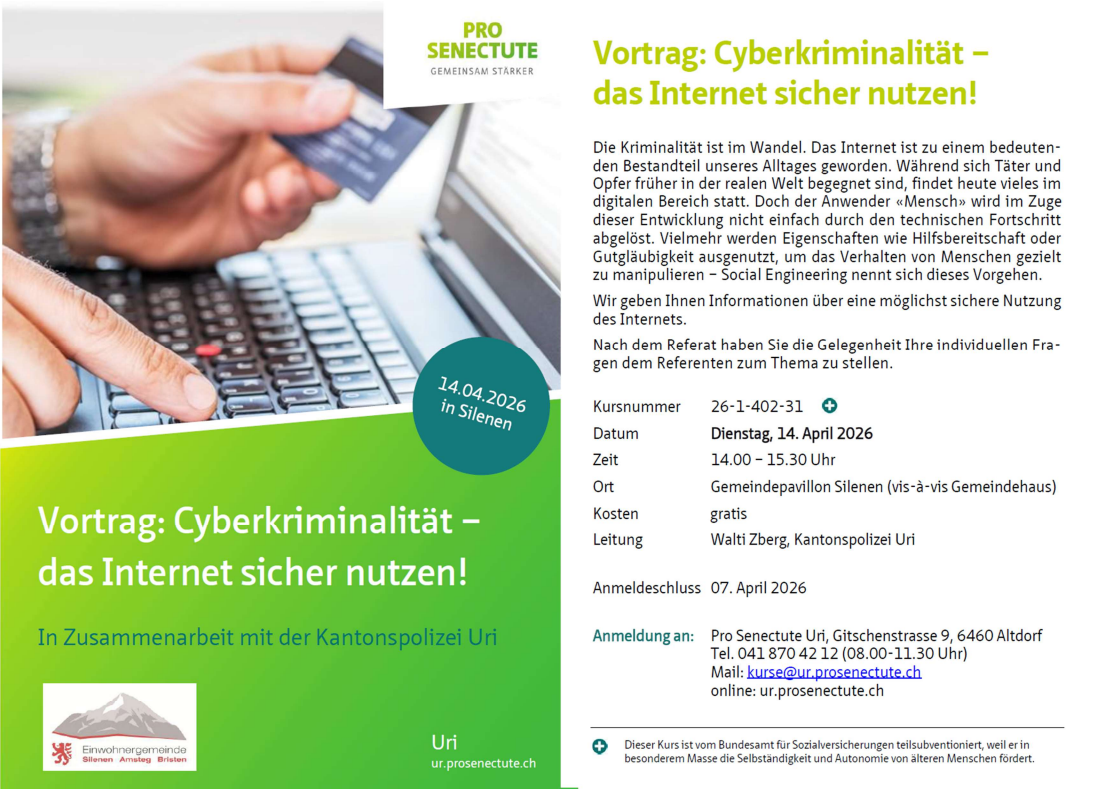 Am Dienstag, 14. April 2026 im Gemeindepavillon Silenen (vis-à-vis Gemeindehaus). Anmeldeschluss ist bis am 07. April 2026 bei der Pro Senectute Uri (041 870 42 12 / info@ur.prosenectute.ch).
